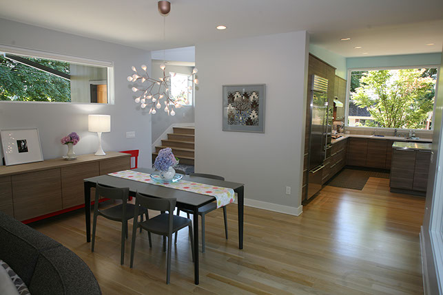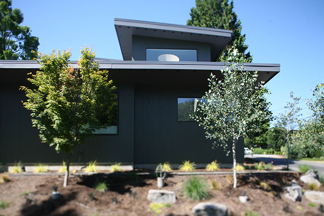 A dramatic 2 story entry with a circular skylight above welcomes visitors to this house. The Krueger House is a new 2500 SF house in SW Portland. The house has one story living for a couple designed around a courtyard, with room upstairs for visiting family members and an office. Even with lots of glass, and an interior bathed in light, the house provides much privacy from the street.
